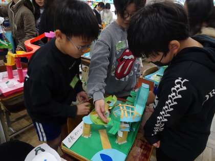 ビー玉を転がしたり落としたりして楽しむ「コロコロガーレ」が完成しました。今日は、1組と2組で交流をしました。互いの工夫を見つけて伝えあい、楽しい時間でした。