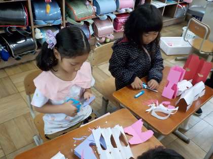 切った形をみんなで話し合い、動物や建物に見えることを発見しました。