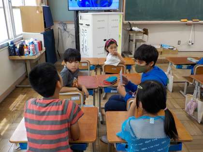 2〜6年生のお兄さんやお姉さんたちに自己紹介をしたり、たてわりグループでやってみたい遊びを伝えたりしました。