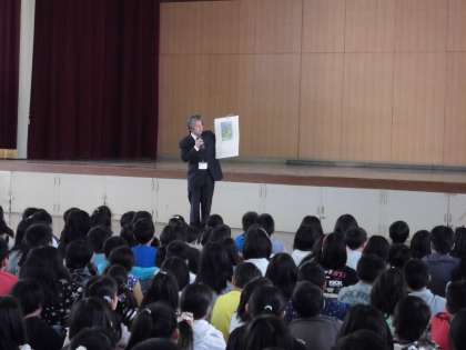 さて,今日の学校朝会に,1年生が初めて参加しました。1年生も,それを見守る上級生も,とても立派な態度で話を聞くことができました。