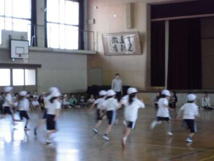 1年生が,新体力テストのシャトルランを行っている様子です。6年生が1年生の記録をとるなどお世話をしながら,応援してくれました。
