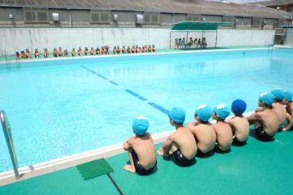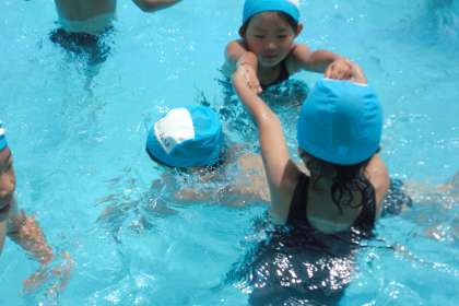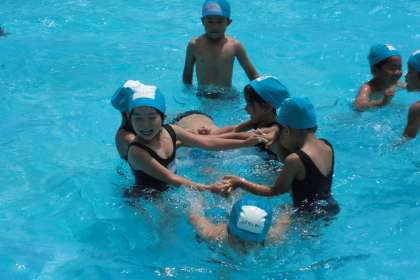 水遊びの学習が5回目となりました。子どもたちは徐々に水に慣れ、顔をつけたり、輪をくぐったりできるようになりました。今日は子どもたちが作ったトンネルの中をくぐりました。