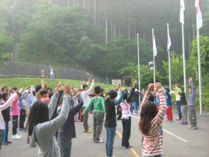 気温22度のすがすがしい朝を迎えました。朝霧の中,朝の集いで今日のめあてを発表して確かめ合い,ラジオ体操をして体も動かしました。