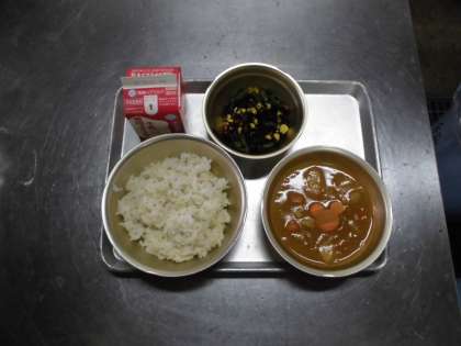 今日の献立・・・麦ごはん・牛乳・ひじきのソテイ・チキンカレー