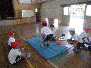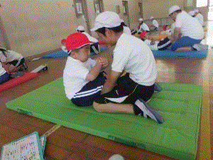 昨日に引き続き今日も新体力テストを行いました。今日は1年生と6年生がペアとなり,一緒に体力テストを行いました。1年生にとっては初めての事で戸惑いも見られましたが,6年生が最高学年として一年生の見本となり,活動を引っ張ってくれていました。頼りになる6年生のサポートを受けて,1年生も安心してのびのびと活動することができました。