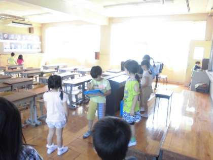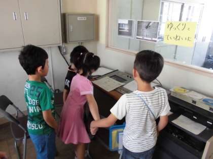 5月1日に,学校たんけんに行きました。2年生と手をつなぎ,学校のいろいろな部屋を案内してもらいました。1年生は放送室のマイクや機械や音楽室の楽器を見て興味津々でした。