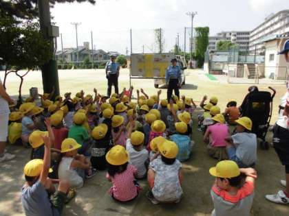 交通安全教室で,警察の方の話をしっかり聞いたり,教えてもらった通りに歩いたりしました。自分の身を自分で守れるように交通ルールをしっかり覚えていきます。