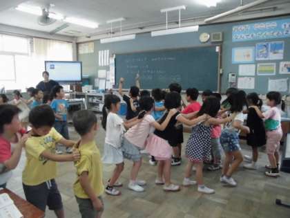 1年生の教室から,楽しそうな歌声が聞こえてきました。のぞいてみると音楽の時間,ジェンカを踊りながら歌っている姿が見られました。笑顔がいっぱいです。友だちと一緒だからこそできる,楽しい学習の一コマでした。