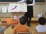 最初は,少し緊張していた子どもたちも,「大きなかぶ」のエプロンシアターが始まると徐々に緊張がほぐれ,最後にはみんなで協力して声を出すことで無事に大きなかぶは抜けました。