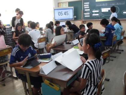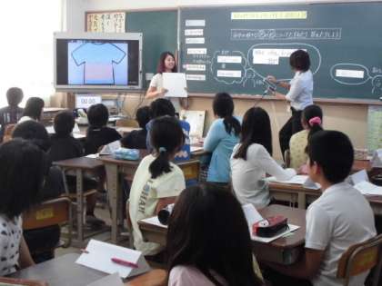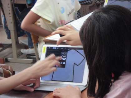 5年生は,お気に入りのTシャツをデザインする活動を通して,好きな色や形を尋ねたり答えたりする学習をしました。タブレットを使って,友だちのお気に入りTシャツを視覚的に表しました。