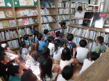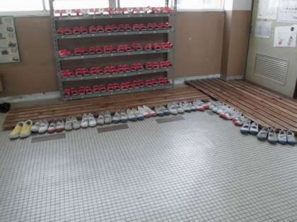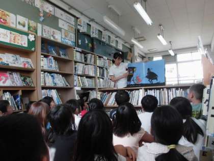 図書室前の上靴がとてもきれいに並んでいます。何年生がいるのかな?とのぞいてみると,2年生でした。図書支援員から大型絵本「すてきな三人組」を読んでもらっていました。とても集中して聞いている姿にも感心しました。