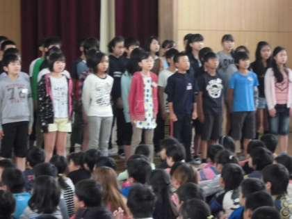 式の後は,6年生が「ふるさと」を合唱し,全校の皆に聴かせてくれました。来週には,久世中学校の合唱祭で披露します。とても美しい歌声で,下学年も聴き入っていました。