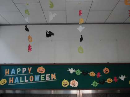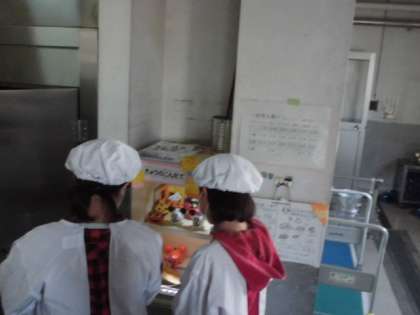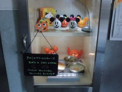 今日の「きのこのクリームシチュー」の中には,お化けやコウモリの形をしたにんじんが入っているとあって,子どもたちは,うきうき!わくわく!「いくつ入っているんかなあ」「楽しみやなあ」などと話しながら給食を運んでいました。