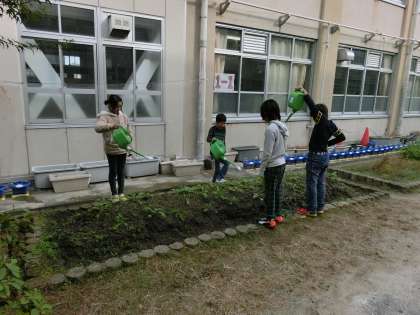 水をたくさんあげることを意識しながら,何度も水道と畑を往復をして水やりを頑張っています。