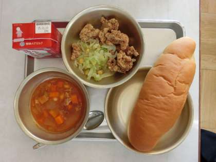 一つ目はメニューで,ミルクコッペパンとミネストローネ,スパイシーチキンとソティーと子どもたちにも大人気のメニューでした。
