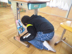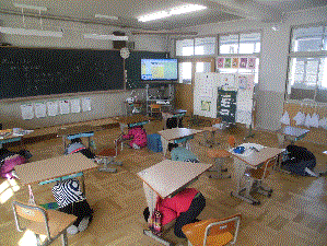 シェイクアウト訓練が始まると,事前に学習した「まず低く」「頭を守り」「動かない」という三つの安全行動を落ち着いて行いました,子どもたちから進んで身を守ろうとする行動がみられ,防災意識を高める取り組みになりました。