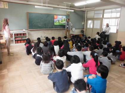 4年生は学年集会で,どんな1年間にしていくかを確認していました。学年目標「己努愛楽」(きどあいらく,とよむそうです)についても文字に込められた意味や願いを考えていました。