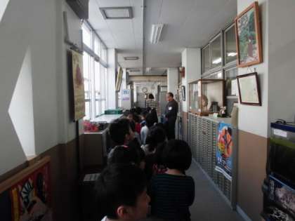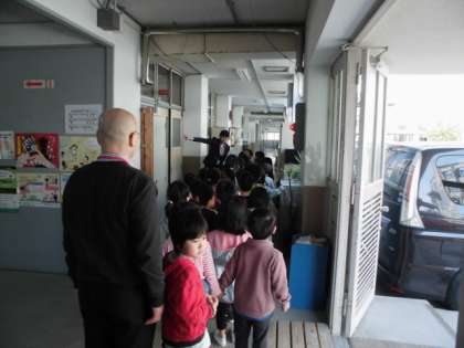 担任の先生と一緒に学校めぐりをしていました。職員室・管理用務室・保健室などこれからの生活で必要になるところを憶えています。周りが気になるようですが,静かにまわることができていました。
