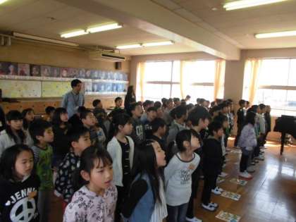 3年生は,教科担当の先生と一緒に音楽室で学習しました。大藪校の校歌を歌いましたが,2番3番になると,少し歌詞が怪しいところもあるようです。世界に一つしかない自分たちの校歌を大切に,という話も聞き,何度も練習するうちに,声がまとまり,きれいな響きになってきました。
