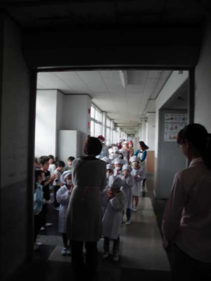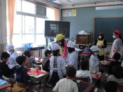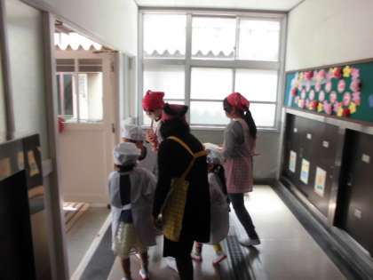 今日から給食が始まりました。1年生にとっては,小学校生活初めの給食です。当番はきちんと並んで給食室に行き,6年生に教えてもらいながら気を付けて運びました。