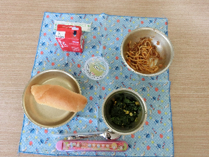 今日の献立は,大人気のスパゲッティで子どもたちも「今日はスパゲッティ」「今日はりんごゼリーもあるよ」と朝から給食をとても楽しみにしていました。
