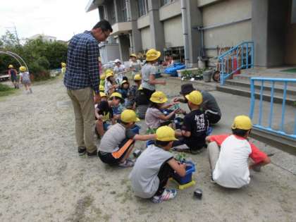 2年生は,地域の「野菜博士」に教わりながら一人一鉢の野菜の苗を植えました。「ぼくは,オクラ。ねばねばが好きやねん。」「トマトのにおいするで。」など,口々に話してくれました。