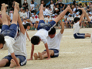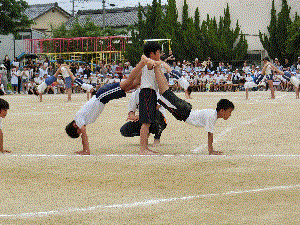 練習の時から服が汚れることも気にせず,何度も何度も練習を繰り返してきました。最初は自信がなかった技も本番の組体操では自信を持って取り組んでいました。