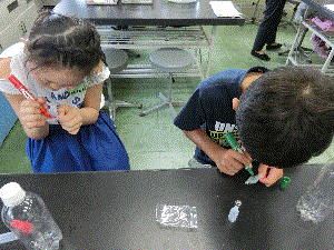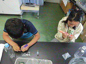上下に動くものと,回転しながら浮き沈みするものの二種類の浮沈子を作りました。子どもたちは,上手く浮沈子が動くように何度も何度も繰り返し実験を行っていました。