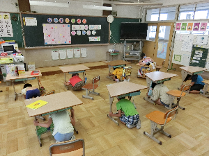避難訓練では,放送を聞いて素早く机の下に隠れ,避難場所の体育館までみんなで助け合いながら行動しました。