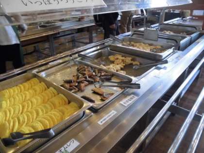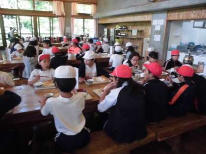 初めて食堂でバイキング形式の朝食をとりました。今日一日の活動がしっかりできるように、みんな栄養バランスを考えて食べていました。