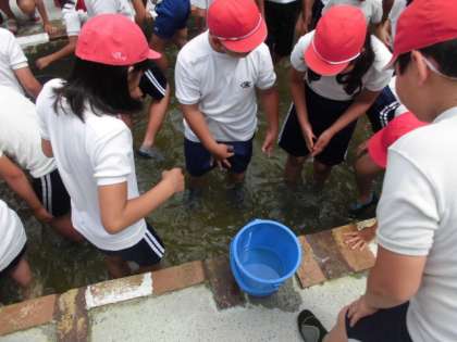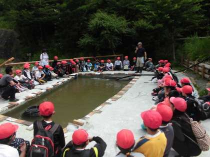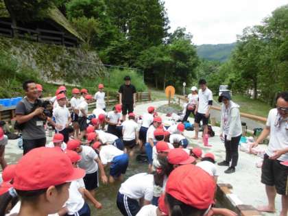 午前最初の活動は、ハナコロ池での魚つかみです。魚の動きは意外に速く、捕まえるのに一苦労した子も多かったですが、みんな頑張りました。