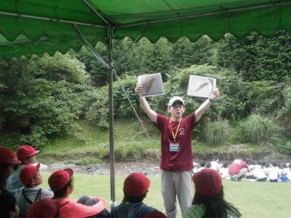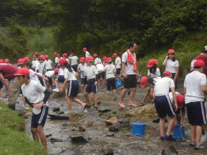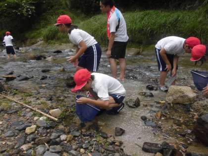 親水広場は久世を流れる桂川の上流にあたります。「きれいな水に住む生き物は発見できるのか?」山の家の所員の方の話をしっかり聞いてから,みんなで一生懸命生き物を探しました。