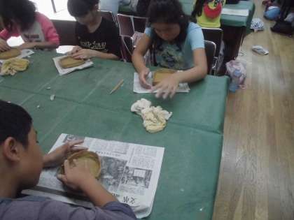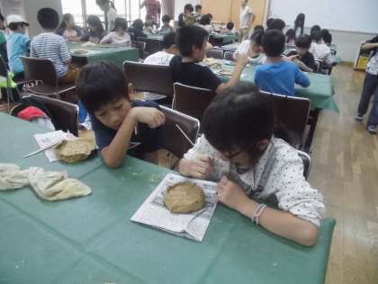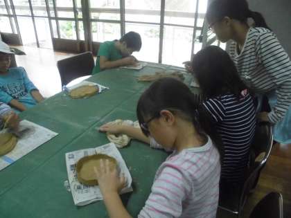 土の冷たさを感じながら,1組は宿泊学習のたくさんの出来事を思い出しながらの花背焼き作りです。
