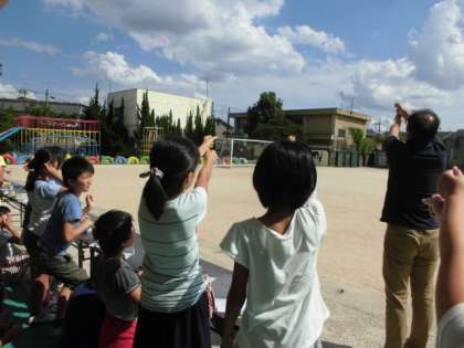 4年生が運動場に出て,何やら器具を使って観察をしています。みんなが見ている方向には・・・青空の中に白い三日月!月の動きの学習で,昼間の月を観察していたのでした。暑い中,よく頑張っていますね。