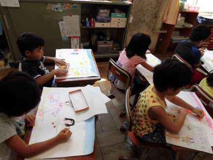 おじいちゃん,おばあちゃんに感謝の気持ちを届ける絵をかきました。