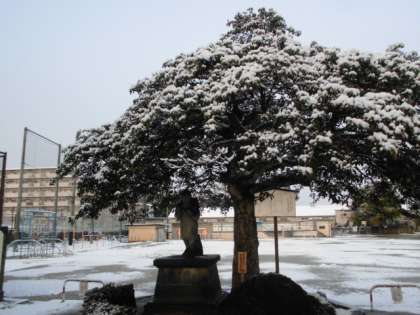 この冬一番の寒波の影響で,土日に雪がたくさん降りました。運動場も雪景色,金次郎さんも寒そうです。子どもたちは,朝から雪を集めたり,雪玉を放たりして雪を楽しみながら登校していました。