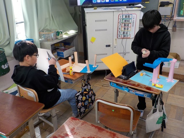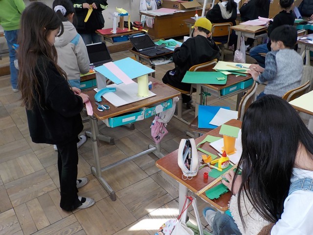 段ボールや画用紙を使って、ビー玉が転がる仕組みの作品を作っています。コースをカーブにしてみたり、落とし穴を作ってみたりと様々な工夫が見られます。完成が楽しみですね。