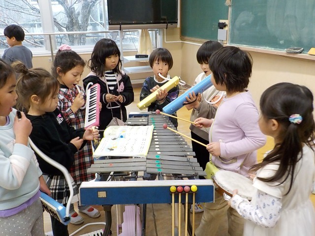 鍵盤ハーモニカと打楽器に分かれて、いろいろな音色を合わせて演奏するのを楽しんでいます。