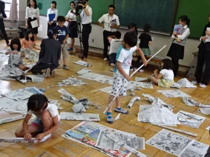 2年生は図工で新聞紙を使って新聞紙を変身させています。