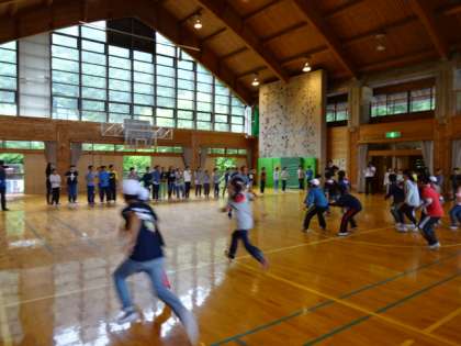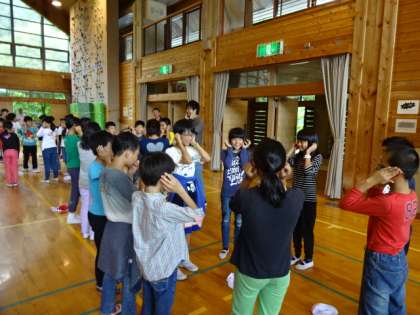 山の家最初の活動は「アイスブレイク」。大薮小と合同での取組です。2校の子どもたちがもっと仲良くなるために,タイトルのごとく「氷を溶かし」ました。校長先生の主導のもと,「声出しゲーム」「もしもし亀よ,亀さんよゲーム」「猛獣狩りゲーム」「クワガタゲーム」「すり抜けゲーム」といった,たくさんのゲームをしました。