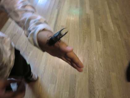 夜,山の家の館内に「クワガタ」が現れました。子どもたちは大興奮。クワガタを持ってこそっと先生に近づき,先生を驚かせていました。