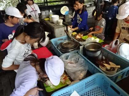 2日目午後のメインは「野外炊事2回目」。昨日の反省を生かそうと班で協力しながら今日は「すき焼き風煮」を作りました。今日は途中から雨が降り,思うように火の調節ができない班も多々ありましたが,できた人はできてない人の仕事を手伝いながら頑張りました。できあがったごはんはみんなでおいしくいただきました。