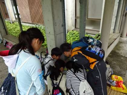 花背の自然の学習の後は,「館内ラリー」です。クラスごとに「虫コース」「鳥コース」に分かれ,グループで館内に隠されている10問の問題を探して解いていきました。階段の裏といった死角や高いところ,また手すりの下など,人目につかないようなところに問題が隠されており,子どもたちは班で協力しながら館内探検を楽しみました。