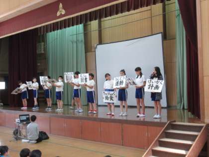 今年度初めての児童朝会。今回は,各委員長から委員会ですることについての話がありました。各委員会とも,昨年度とは少し違った新たな試みを企画しており,今からとても楽しみです。