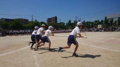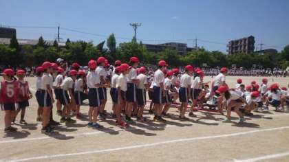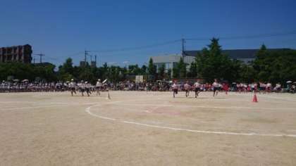 なかよし種目の台風の目です。5年生が外を走り,3年生が内を走ります。
