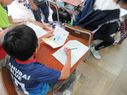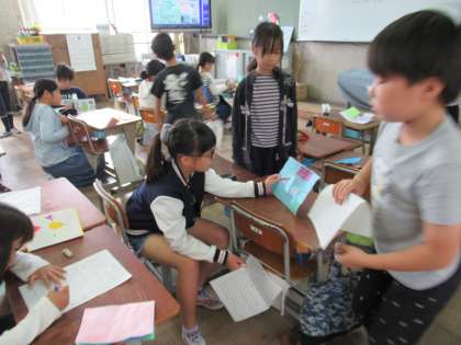 今回は鑑賞の活動。友達が作った飛び出すメッセージカードの良いところを見つけることができていました。