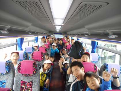 大型バスにのって三重県志摩市にある「みさきの家」に向かいます!レッツゴー。写真を撮ったときの合言葉は,みんなでがんばるみさきの〜〜〜〜??