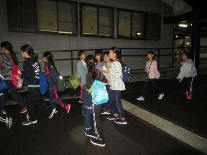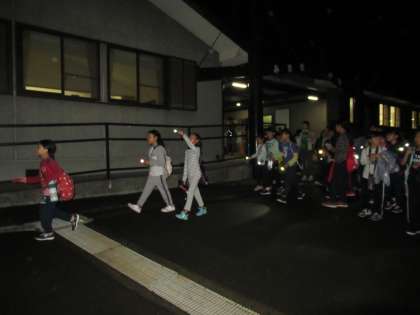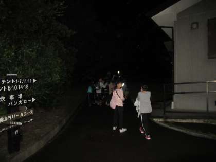 女子はバンガローで寝ます。みんなで懐中電灯をもって,90畳からバンガローへ。