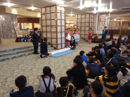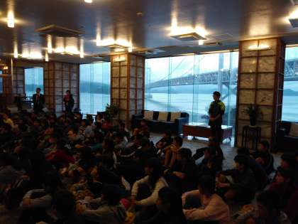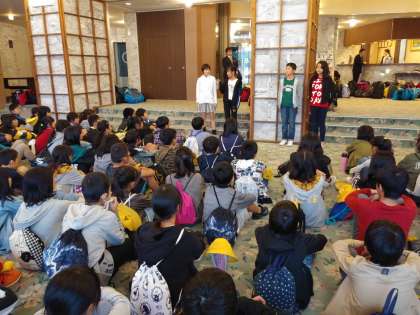 本日の宿泊施設,ベイリゾートホテル鳴門海月さんに着きました。宿の自慢は、ロビーからの景色です。海と大鳴門橋が見えるでしょうか??