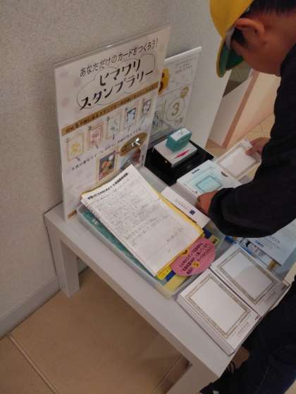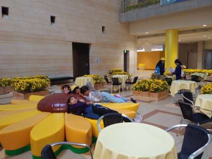 大塚美術館内でゴッホのひまわりのイベントをしています。ひまわりがたくさん飾られていたり,ひまわりの形の気持ちいいソファーもあったりします。スタンプラリーもあって,子どもたちが夢中で探して回っています。